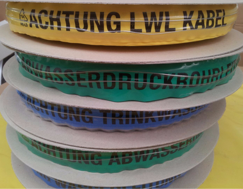 Die Trassenwarnbänder gibt es, je nach Anwendungsbedarf,in verschiedenen Breiten,Längen,Grundfarben (gelb,blau,rot grün) und Aufdrucktexten,die aufschluss darüber geben,um welche Leitungsarten es sich handelt (z.B "Achtung Starkstromkabel",Achtung Abwasserleitung" usw). Bereit anhand der Farbe des Trassenwarbandes lässt sich erkennen,welche Art der Leitung darunter liegt. Gasleitung ,Erdkabel, Starkstromkabel werden mit gelbem oder rotem,Wasserleitung mit blauem und Regen-und Abwasserleiungen mit grünem Band markiert.