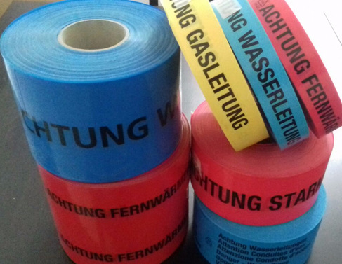 Die Trassenwarnbänder gibt es, je nach Anwendungsbedarf,in verschiedenen Breiten,Längen,Grundfarben (gelb,blau,rot grün) und Aufdrucktexten,die aufschluss darüber geben,um welche Leitungsarten es sich handelt (z.B "Achtung Starkstromkabel",Achtung Abwasserleitung" usw). Bereit anhand der Farbe des Trassenwarbandes lässt sich erkennen,welche Art der Leitung darunter liegt. Gasleitung ,Erdkabel, Starkstromkabel werden mit gelbem oder rotem,Wasserleitung mit blauem und Regen-und Abwasserleiungen mit grünem Band markiert.
